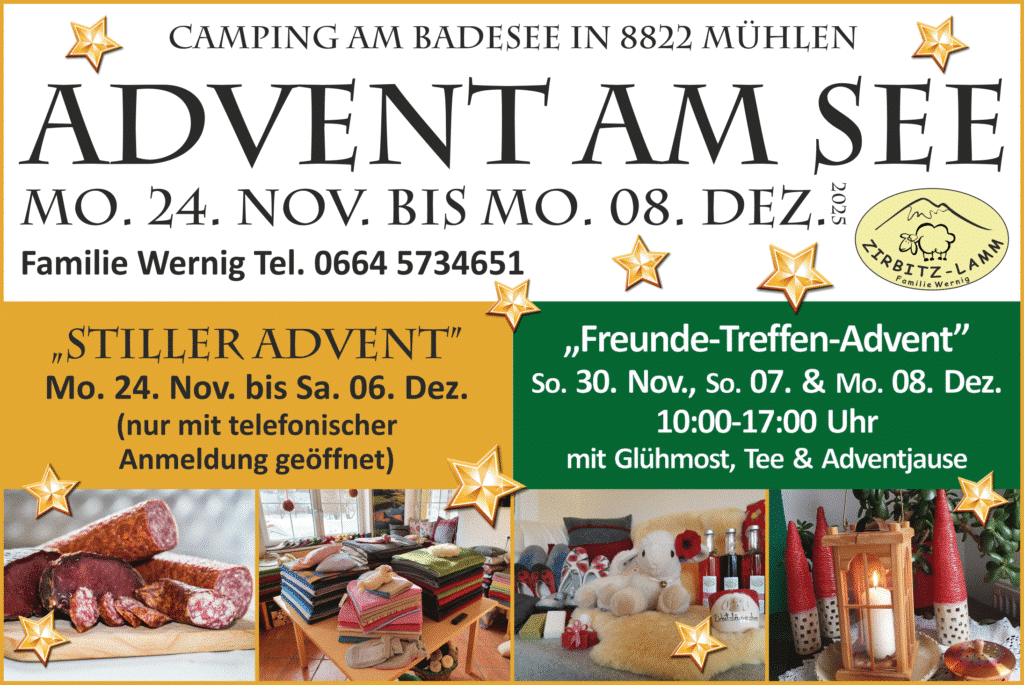 Am Fuße des Zirbitzkogels in der Steiermark lässt sich´s am bis zu 26 Grad warmen Badesee Mühlen idyllisch campen. Lassen Sie sich vom Vogelgezwitscher aus den Birkenbäumen wecken! Machen Sie einen Morgenspaziergang rund um den Mühlner See oder angeln Sie mit den anderen Petrijüngern den Karpfen fürs Mittagessen. Wandern Sie auf über 100 km markierten Wanderwegen durch den Naturpark Zirbitzkogel-Grebenzen und besuchen Sie Sehenswürdigkeiten im angrenzenden Mittel-Kärnten. Lassen Sie die Kinder rund um den See spielen und genießen Sie ein kühles Bier oder ein regionales Lammgericht in unserem Gasthaus. Freuen Sie sich auf einen erholsamen Natururlaub am Campingplatz in Österreich!
